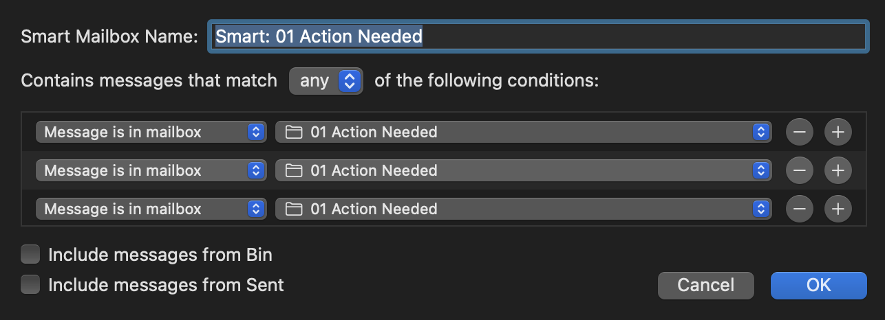 In Apple Mail I use Smart Lists. I have several email accounts and create a list that aggregates emails with a given label from multiple accounts. This gives me a combined “Action Needed,” “Someday,” and “Waiting For” list.